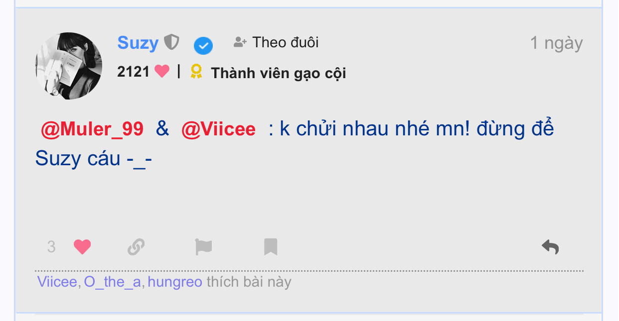 E chả giải thích với bác rồi, htrc e vừa chửi thg Muler-99 lanh tành bành gặp topic nào e chửi cho nó chạy mất dép nên bị ad Suzy cắm mắt nên giờ ngôn từ rón rén hạn chết từ ngữ nóng :))))