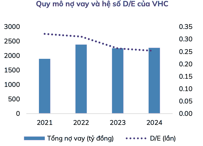 Quy mô nợ giảm dần qua các năm, tỷ lệ D/E năm 2024 là 0.24 lần, với nguồn tài sản thanh khoản cao duy trì ổn định, đánh giá VHC không gặp rủi ro gì liên quan đến các khoản nợ hiện có.