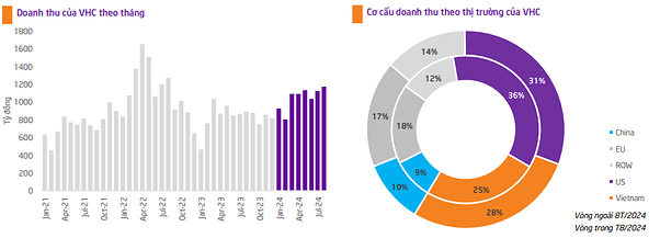 Về mặt thị trường, doanh thu từ thị trường Mỹ và EU đã đóng góp chính vào sự tăng trưởng trong tháng 8. Cụ thể, doanh thu từ thị trường Mỹ đạt 203 tỷ đồng, tăng 97% yoy, trong khi doanh thu từ thị trường EU đạt 424 tỷ đồng, tăng 51% yoy. Tính lũy kế trong 8 tháng, doanh thu từ Mỹ đạt 1.582 tỷ đồng (+22% yoy) và từ EU đạt 1.456 tỷ đồng (+25% yoy). Ngược lại, doanh thu từ thị trường Trung Quốc tiếp tục suy yếu, chỉ đạt 105 tỷ đồng trong tháng 8, giảm 34% yoy, lũy kế 8 tháng đạt 863 tỷ đồng (+2% yoy).