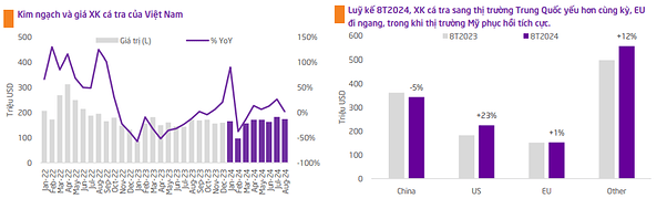 Thị trường Mỹ ghi nhận sự tăng trưởng mạnh mẽ với kim ngạch xuất khẩu đạt gần 34 triệu USD trong tháng 8, tăng 31% yoy. Giá xuất khẩu cũng tiếp tục cải thiện, đạt khoảng 3,17 USD/kg, tăng 6% yoy. Trong khi đó, thị trường EU có dấu hiệu giảm sút, với kim ngạch xuất khẩu tháng 8 giảm 10% yoy. Dù vậy, dự báo thị trường EU sẽ cải thiện trong các tháng cuối năm nhờ nhu cầu tiêu dùng tăng trong kỳ nghỉ lễ và tỷ lệ thất nghiệp ở mức thấp.
