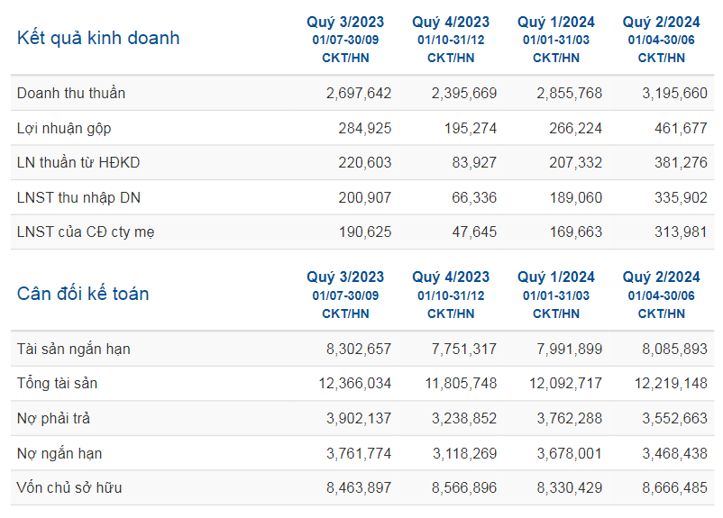 Lũy kế 6 tháng đầu năm 2024, Vĩnh Hoàn ghi nhận doanh thu đạt 6.074 tỷ đồng, tăng 22% so với cùng kỳ năm trước, trong khi lợi nhuận sau thuế đạt 484 tỷ đồng, giảm 27%. Tính đến nay, công ty đã hoàn thành 57% kế hoạch doanh thu và 60% kế hoạch lợi nhuận cho năm 2024 theo kịch bản cơ sở.