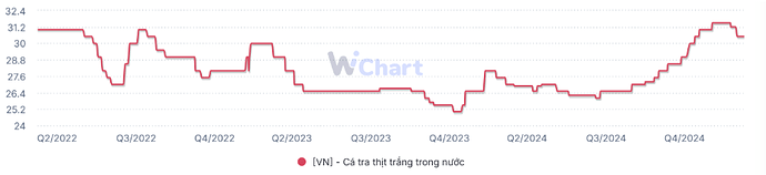 Như vậy, có thể thấy việc sụt giảm doanh thu trong tháng vừa qua chủ yếu đến từ việc các doanh số tại các thị trường có sự phân bổ không đồng đều. Tuy vậy mức giảm chỉ ở con số 3% do được bù đắp từ việc giá cá tra tăng mạnh từ cuối 2024 tới nay, thậm chí vượt đỉnh 3 năm. Nguyên nhân là do lo sợ dịch bệnh trong bối cảnh lo ngại thiếu hụt nguồn cung cá thịt trắng. Chúng tôi kỳ vọng trong Q2 giá cá sẽ neo ở vùng giá này khi tình hình dịch bệnh cũng như điều kiện thời tiết chưa có nhiều chuyển biến tích cực. (Hình 2)