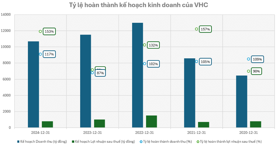 Trong bối cảnh “nguy hiểm” như vậy, nhưng VHC vẫn tự tin đặt kế hoạch doanh thu 2025 kỷ lục, đạt 13.800 tỷ đồng – tăng 10,3% và lợi nhuận ròng đạt 1.500 tỷ - tang 22.3% so với năm trước. Lật về quá khứ, doanh thu và lợi nhuận thực tế của doanh nghiệp này thường khá sát với con số kế hoạch nên chúng tôi kỳ vọng 2025 VHC cũng có thể hoàn thành tốt kế hoạch đề ra. (Hình 1)