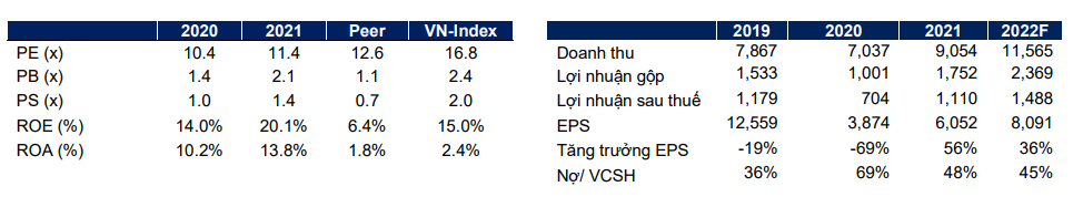 § Năm 2022, BSC dự báo doanh thu thuần và lợi nhuận sau thuế của VHC lần lượt đạt 11,565 tỷ (+28.8% YoY) và 1,488 tỷ (+36% YoY). EPS 2022 là 8,091, tương đương với P/E fw là 8.5.