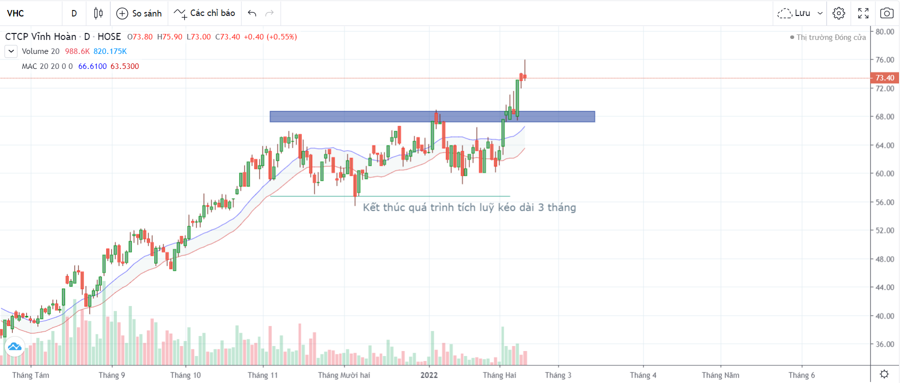 VHC kết thúc quá trình tích luỹ kéo dài 3 tháng khi vượt qua vùng đỉnh lịch sử ở giá 68,000 VND. Khi chạm với vùng đỉnh cũ này, VHC có dao động ngang trong 3 phiên giữ biên giá tốt và bứt phá ở phiên sau đó.