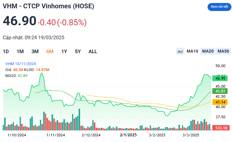 VNDirect Research vừa công bố báo cáo phân tích về CTCP Vinhomes (HoSE: VHM), trong đó nâng mức định giá cổ phiếu từ 48.800 đồng lên 54.300 đồng, tăng 11%. Kết phiên sáng 18/3, VHM có thị giá 47.750 đồng/cp, tức vẫn còn dư địa tăng 14%. VNDirect Research điều chỉnh tăng dự báo giá trị hợp đồng ký mới năm 2025 thêm 0,5% so với dự báo cũ, đạt 103.685 tỷ đồng, nhờ kỳ vọng 3 dự án tại Long An (Vinhomes Green City, City Royal, Sai Gon Golf) và 1 dự án tại Hải Phòng (Golden City) sẽ mở bán sớm vào đầu năm 2025.