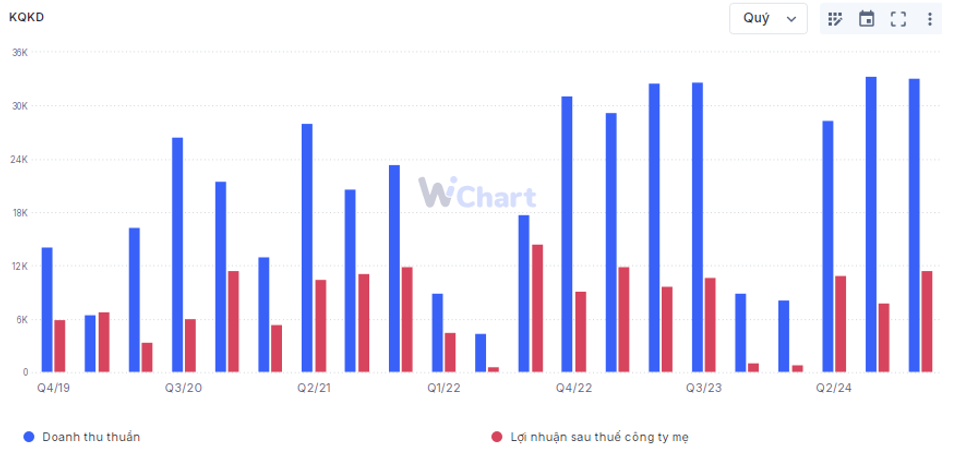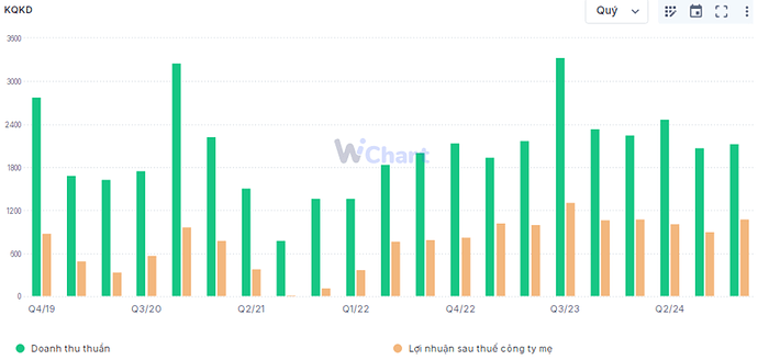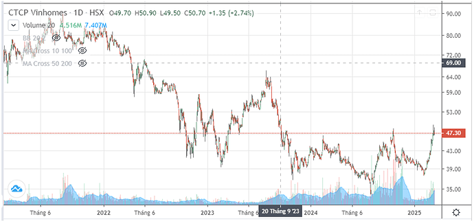 Lũy kế doanh số bán hàng của công ty trong năm 2024 đạt 104 nghìn tỷ đồng, tăng 19% yoy. Doanh số bán hàng nhưng chưa ghi nhận doanh thu đạt 94.2 nghìn tỷ đồng. Tuy kết quả kinh doanh Q4 tăng trưởng rất mạnh so với cùng kỳ cũng như lũy kế cả năm 2024 kết quả kinh doanh của VHM cũng tương đương so với 2023 nhưng nếu nhìn sang bảng giá cổ phiếu của VHM chúng ta lại không thấy có sự đồng thuận giữa KQKD và giá cổ phiếu. Khi ra bctc Q4 vào cuối tháng 1/2025 giá cổ phiếu không hề bật tăng mà vẫn trên đà điều chỉnh. Giá cổ phiếu chỉ bật tăng từ giữa tháng 2 khi có thông tin Vinpearl, công ty trong cùng hệ sinh thái tiến thêm một bước quan trọng trong việc niêm yết lên sàn Hose. Nhìn theo năm cũng vậy, KQKD năm 2024 tương đương kết quả 2023 nhưng giá cổ phiếu thì lại vẫn trong kênh downtrend. Chưa kể dư địa trong năm 2025 tới cũng là khá sáng khi hàng loạt các dự án mới cũng dự kiến được ra hàng như Vin Đan Phượng, Vin Apollo Hạ Long, Phước Vĩnh Tây hay Dương Kinh. (Hình 2)