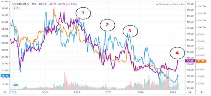 Dưới đây là yếu tố sẽ ảnh hưởng lớn nhất tới diễn biến giá của VHM hay VRE trong2 năm qua và ít nhất trong năm 2025 này. Chúng ta sẽ cùng phân tích và dự đoán cho đợt tăng giá tiếp theo của 2 cổ phiếu này. Đầu tiền về diễn biến giá cổ phiếu từ 2021 cho tới nay của 3 cổ phiếu họ nhà Vin đều chung một xu hướng cũng như các nhịp hồi đều giống nhau, chỉ khác nhau về biên độ phục hồi khác nhau trong mỗi đợt. Như bài gần nhất về VIC chúng tôi đã phân tích chi tiết 4 đợt phục hồi mạnh về giá và trong cả 4 đợt này giá cổ phiếu VHM cũng như VRE cũng phục hồi theo bất chấp FA doanh nghiệp lúc đó đang như thế nào (đánh số 1 tới 4 trong ảnh dưới đây). (Hình 5)