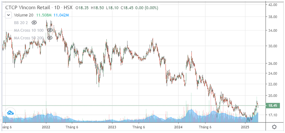 Sang năm 2025 mảng kinh doanh của VRE dự kiến sẽ tốt hơn khi vận hành cả 5 trung tâm thương mại mới trọn cả năm cũng như sẽ đưa vào vận hành thêm 3 trung tâm thương mại mới với diện tích khoảng 117,000 m², tăng thêm 6.5% so với quỹ diện tích hiện có. Ngoài ra 2 dự án Shophouse bên mảng BĐS dự kiến cũng sẽ được ra mắt vào năm 2025 (nằm tại Vinhomes Royal Island và Vinhomes Golden Avenue). Dự án dự kiến đóng góp doanh thu từ 2026. Như vậy có thể thấy về mặt FA của VRE đang khá ổn sau những khó khăn giai đoạn cuối 2021 sang 2022. Thậm chí tiềm năng 2025 cũng là khá sáng, nhưng cũng giống như VHM hay phần nào cả VIC thì giá cổ phiếu lại đang vận hành trong xu hướng ngược lại từ 2021 cho tới nay. Điều này cho thấy giá cổ phiếu VRE hay VHM cũng như VIC đều không vận động theo những vận động FA của doanh nghiệp trong ngắn hạn tính theo quý. (Hình 4)