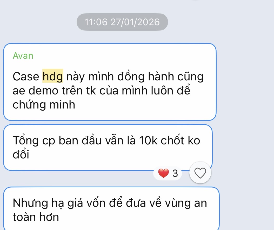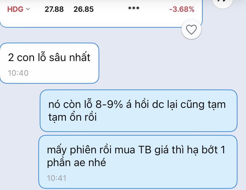 Quay trở lại cp hdg mình đã bán 50k vùng giá trên 3x nhưng nhiều ae tiếc ko bán rồi sau đó than lỗ hoài mình đã nói sẽ đồng hành cùng anh em và show luôn cách để hạ giá vốn mình mua 10k giá gần 28.x và lỗ 9%