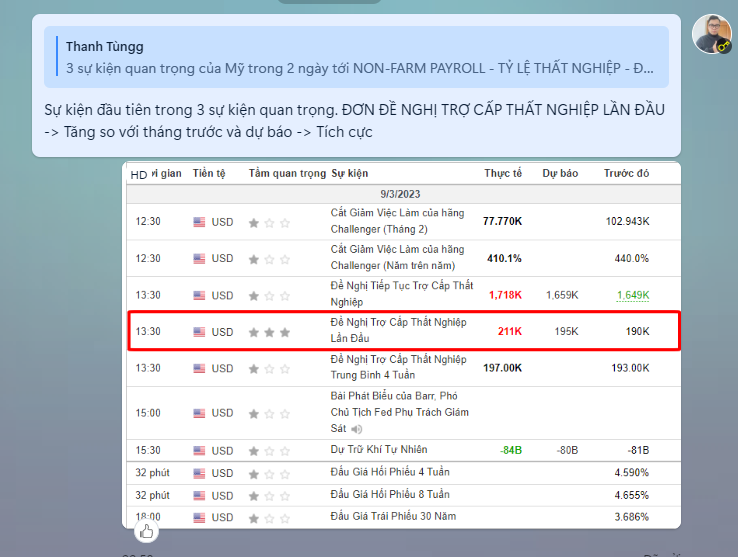 → Tín hiệu tích cực + trước đó đơn đề nghị trợ cấp thất nghiệp lần đầu cho thấy được rằng thị trường lao động đang bị tác động và yếu đi so với tháng trước