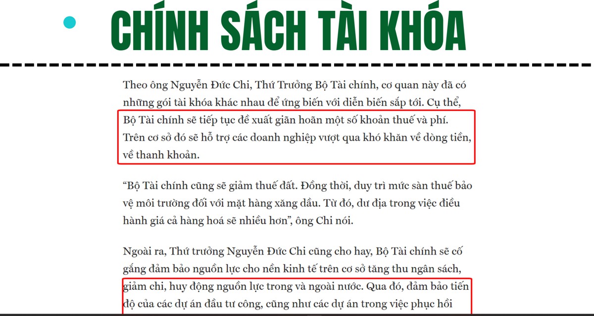 - CHÍNH SÁCH TÀI KHÓA: Với sự nổ lực kiến nghị chính sách MIỄN - GIẢM thuế. Đây sẽ là 1 nguồn tiền cho doanh nghiệp rất lớn với lãi suất bằng 0 chính vì vậy sẽ hỗ trợ rất nhiều cho doanh nghiệp trong vấn đề về thanh khoản