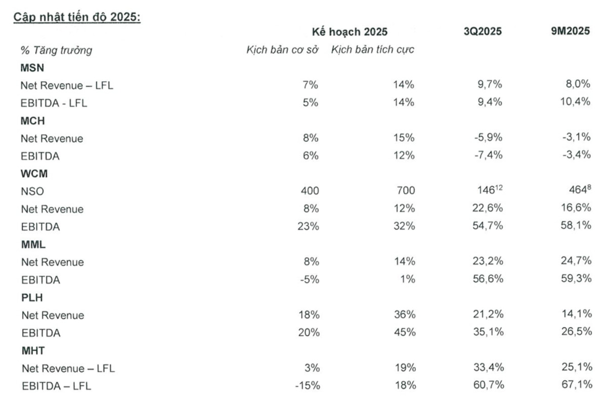 Quý III/2025 tăng trưởng ấn tượng với doanh thu hơn 21.000 tỷ đồng và lợi nhuận sau thuế 1.866 tỷ đồng tăng 43%. → 9T2025, MSN đạt 58.376 tỷ đồng doanh thu, lợi nhuận sau thuế 4.468 tỷ đồng, tăng mạnh 64% so với cùng kỳ, hoàn thành 90% kế hoạch 2025.