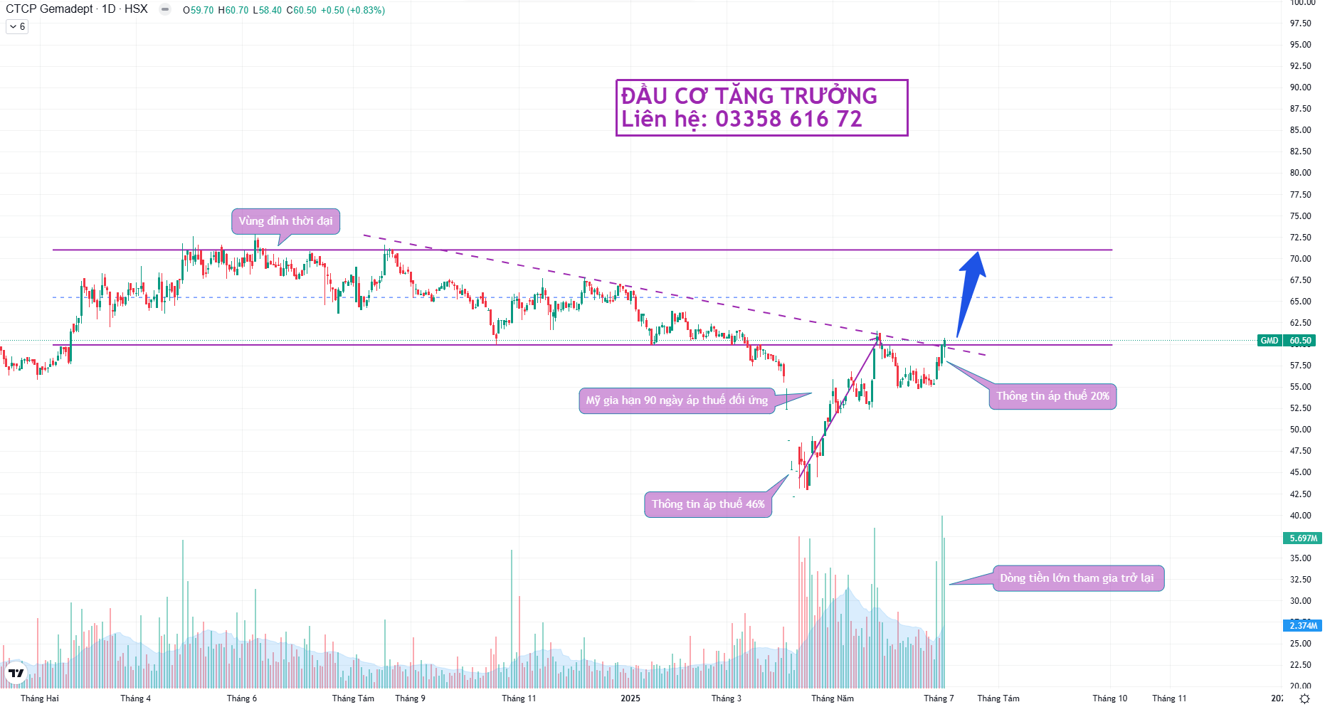 GMD đã xác nhận break mẫu hình tiếp diễn xu hướng tăng từ vùng đáy thuế quan vào phiên 30/6. Kết thúc phiên 3/7, cổ phiếu cho tín hiệu thoát kênh xu hướng giảm từ tháng 8/2024 cho đến thời điểm hiện tại với sự đồng thuận của khối lượng cho thấy dòng tiền tham gia để vào nhịp tăng về vùng đỉnh thời đại
