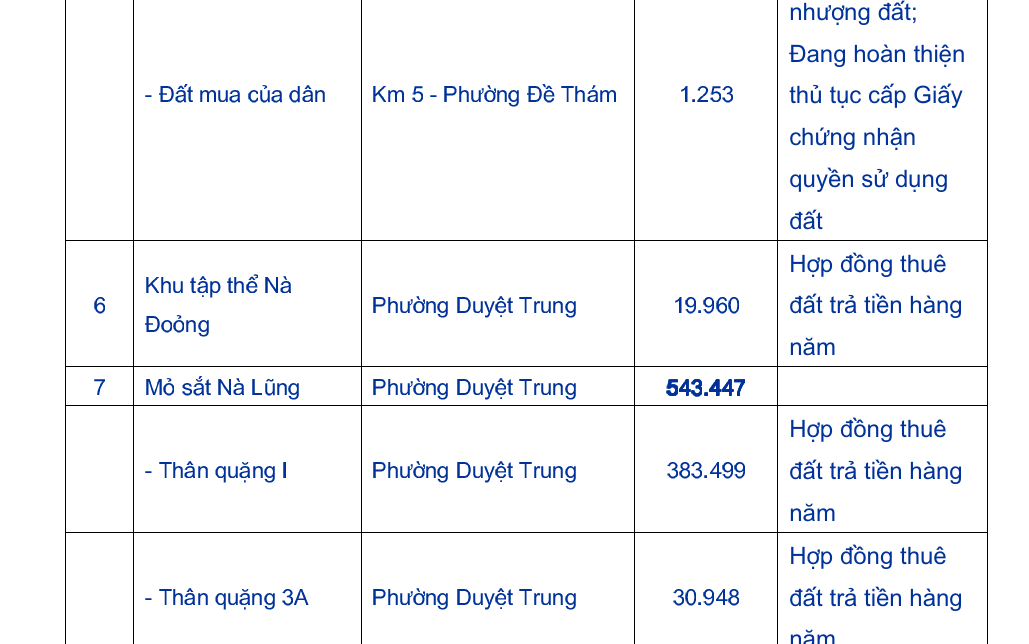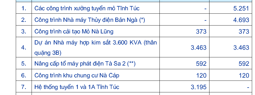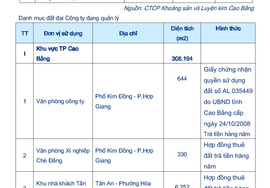 1. Mỏ sắt Nà Lũng. Mỏ có diện tích cấp phép là 39,82 ha; trữ lượng địa chất theo Giấy phép là 9.986.984 tấn quặng sắt; công suất khai thác giai đoạn 1 là 150.000 tấn quặng sắt/năm, giai đoạn II là 300.000 tấn quặng sắt/năm; thời hạn giấy phép khai thác 30 năm…… Theo thống kê, kiểm kê trữ lượng mỏ của Công ty, hiện nay trữ lượng còn lại của mỏ là 1.692.000 tấn (trong đó 679.000 tấn trong ranh giới cấp phép, 1.013.000 tấn ngoài ranh giới cấp phép).