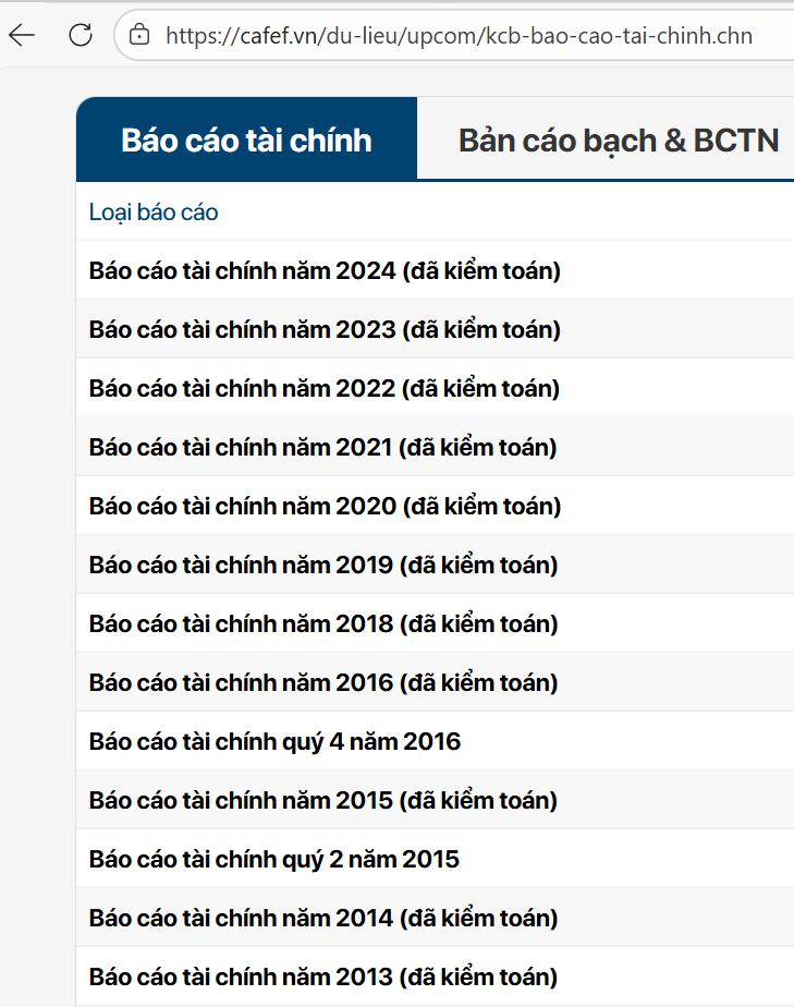 ko nhé bro. doanh nghiệp trên Upcom theo luật không bắt buộc phải nộp báo cáo quý, sẽ tùy từng công ty chọn phương pháp nộp và quy mô cty. nó khác với dn trên HOSE/HNX. KCB nộp bctc hằng năm thôi. Như KCB là rất minh bạch vì năm nào cũng nộp bctc kiểm toán rất chuẩn, bro check cafef sẽ thấy.