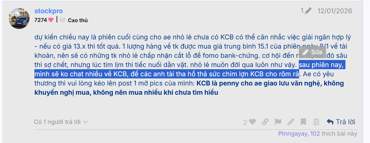 mình nói rồi thì phải. KCB ngon, yên tâm đi. nhưng vì KCB đã tăng 35% nên mình không thích tâng bi, mình ko phải dạng hô hào tâng bi khi cổ đã tăng. nên mình sẽ chat ít đi ở KCB. kệ nó chạy. từ 3 hôm trc mình đã bảo vậy rồi mà.