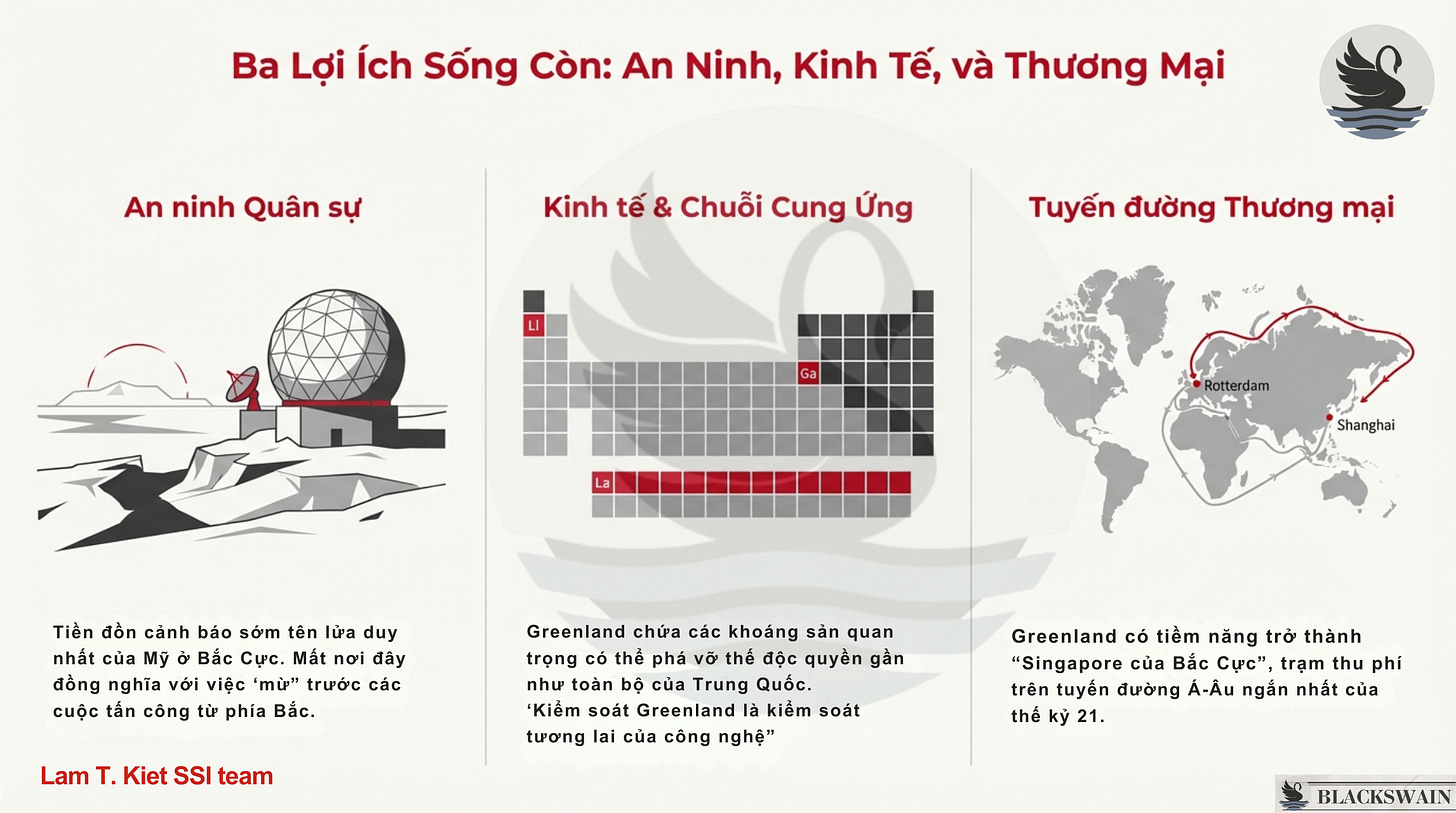 Chưa kể tuyến hàng hải Bắc Cực có thể rút 20 ngày vận tải Á – Âu , biến Greenland thành một “trạm thu phí” đúng nghĩa. Nếu Singapore là nút thắt của Vịnh Malacca, thì Greenland là phiên bản phương Bắc.