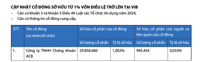 Trong diễn biến khác, ngày 28/2, VIB công bố cập nhật cổ đông sở hữu từ 1% vốn trở lên. Đó là Công ty TNHH Chứng khoán ACB (ACBS) nắm giữ hơn 29,85 triệu cổ phiếu VIB, chiếm 1,002% vốn điều lệ. Ngoài ra, người có liên quan đến ACBS sở hữu thêm 995.454 cổ phần, tương ứng 0,033%. Tổng tỷ lệ sở hữu của nhóm này đạt 1,035%, tương đương hơn 30,85 triệu cổ phiếu.