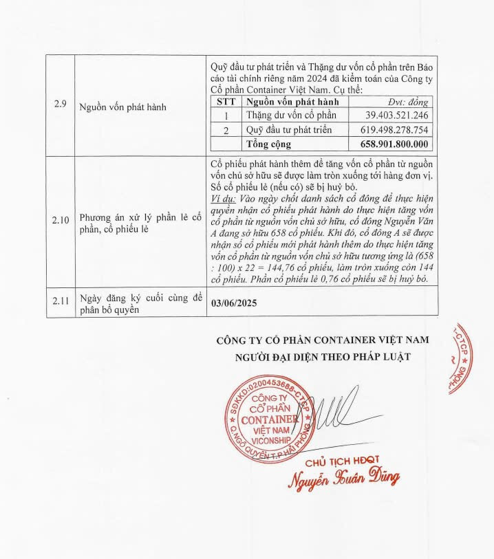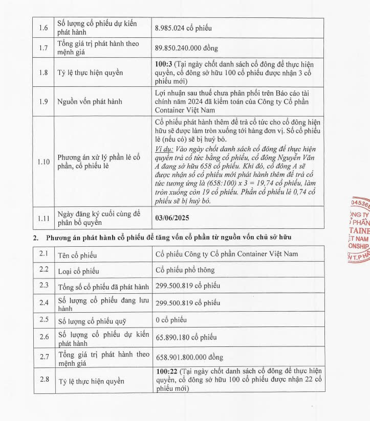 VSC thông báo trả cổ tức 2024 bằng cổ phiếu tỷ lệ thực hiện quyền 100:3 NĐKCC 3/6/2025 và phát hành thêm gần 300 triệu cổ phiếu để tăng vốn tỷ lệ thực hiện quyền 100:22 NĐKCC 3/6/2025