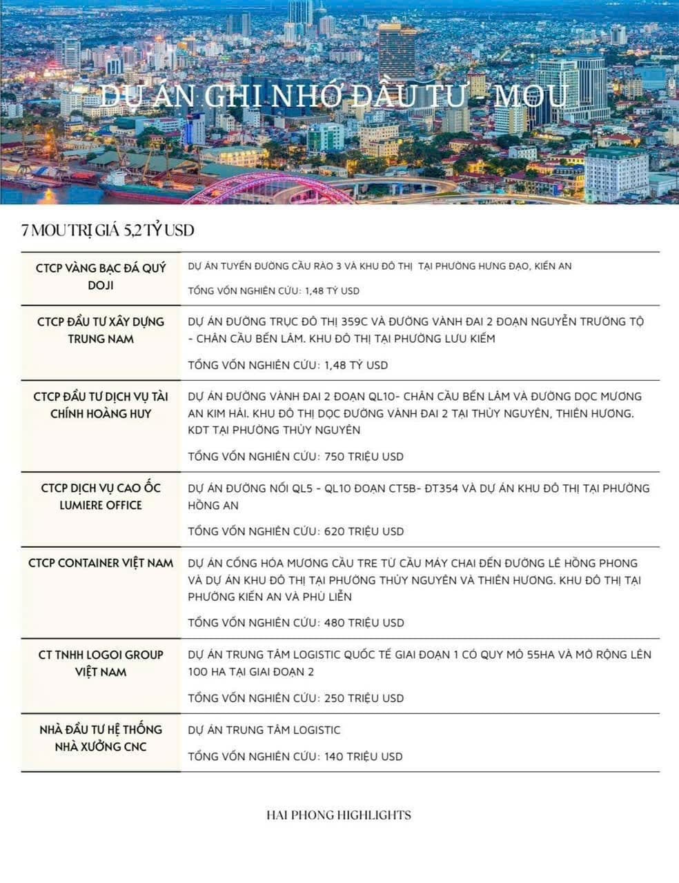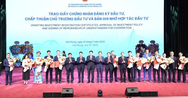 TP. Hải Phòng vừa trao Giấy chứng nhận đăng ký đầu tư 32 dự án và 7 bản ghi nhớ hợp tác đầu tư với tổng vốn đạt hơn 15,6 tỷ USD, mở ra nhiều triển vọng trong phát triển giao thông đô thị và quy hoạch khu dân cư hiện đại. Trong đó có Container Việt Nam (VSC), 480 triệu USD cho tuyến đường cầu Máy Chai - Lê Hồng Phong và các khu đô thị tại Kiến An và Phù Liễn.