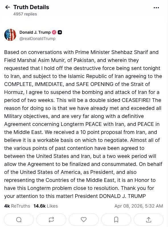 TIN NÓNG: Trump tuyên bố trên Truth Social rằng ông sẽ tạm ngừng các cuộc tấn công vào Iran trong hai tuần, với điều kiện Iran “mở cửa hoàn toàn, ngay lập tức và an toàn eo biển Hormuz”.