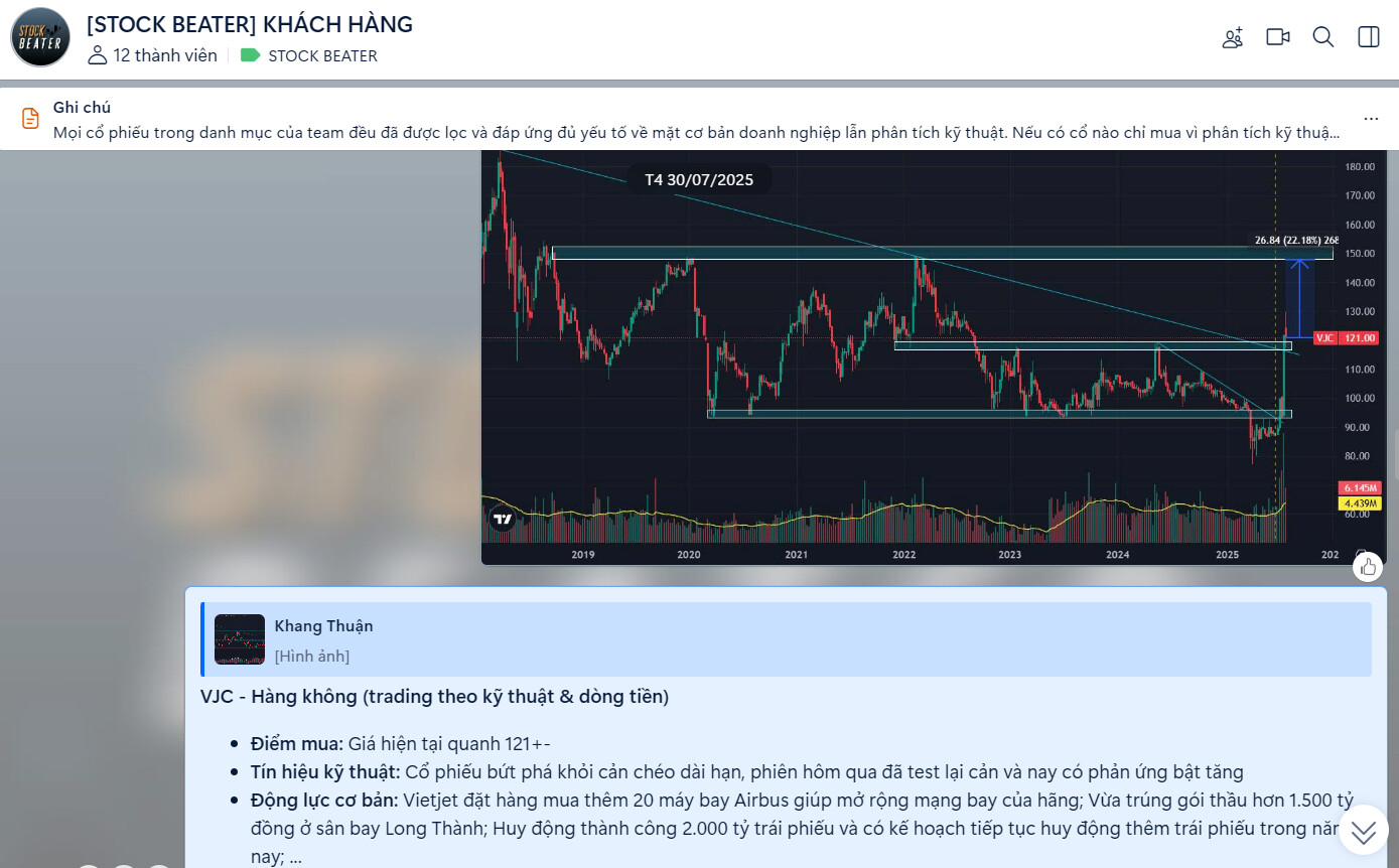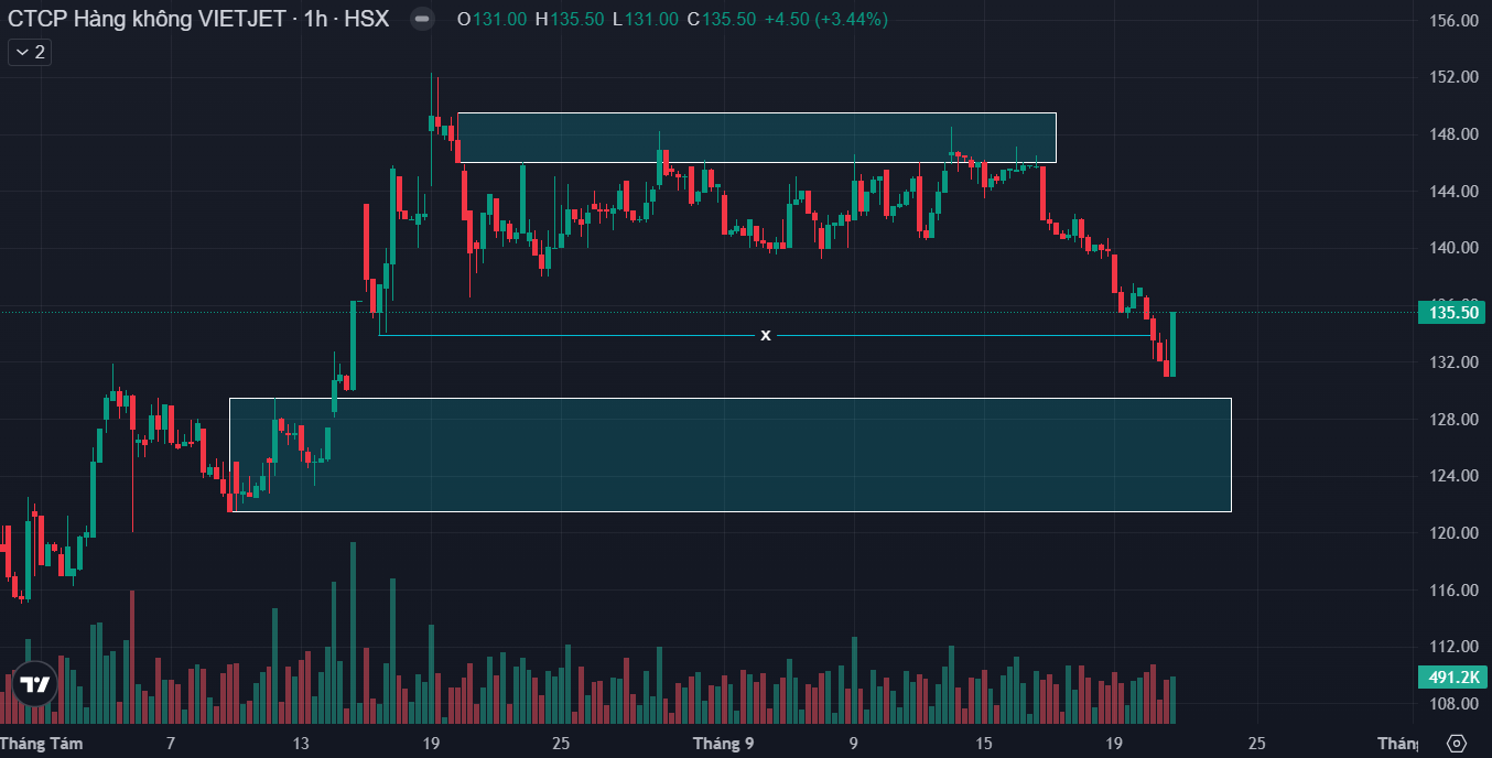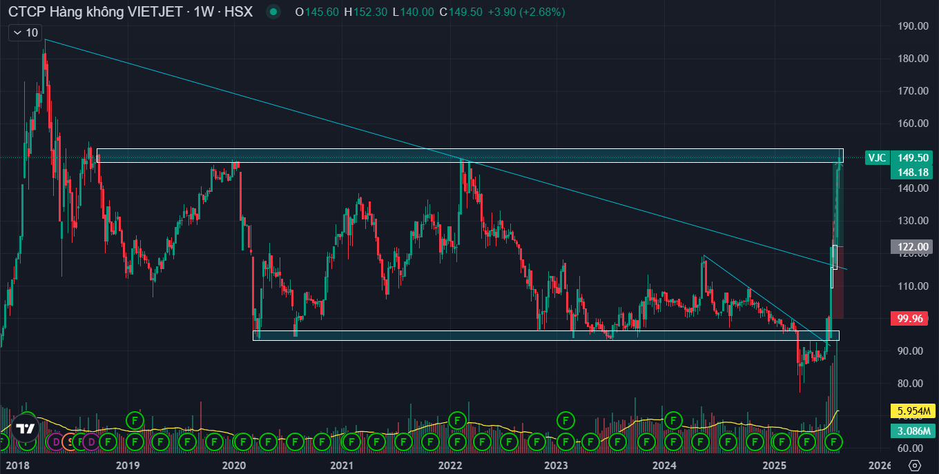 Quan sát khung tuần của VJC có thể thấy cổ phiếu đã bứt phá khỏi cản chéo lớn và đã có nhịp test lại cản → Vượt khỏi kháng cự của xu hướng lớn và đã có nhịp test cản, kỳ vọng tiếp tục mở sóng cho xu hướng tăng mới