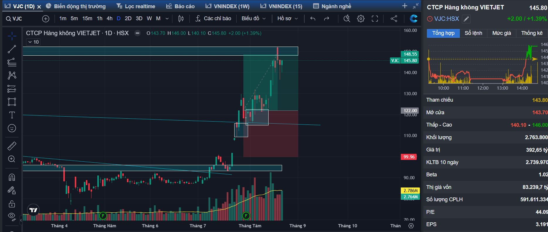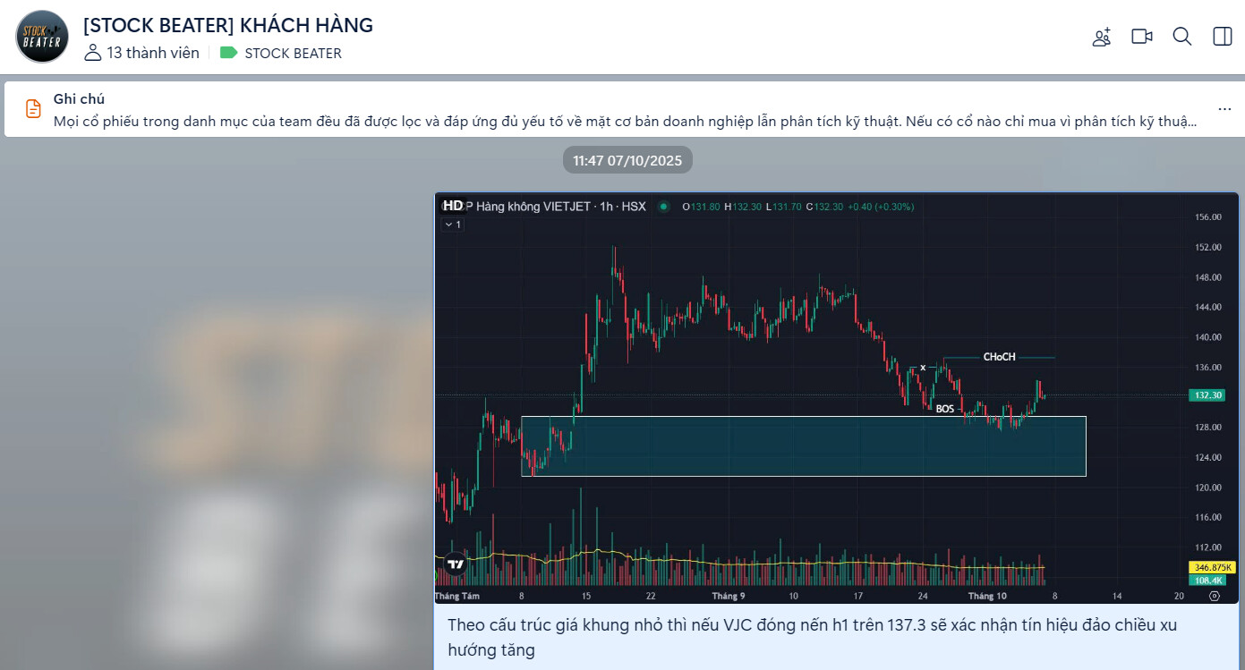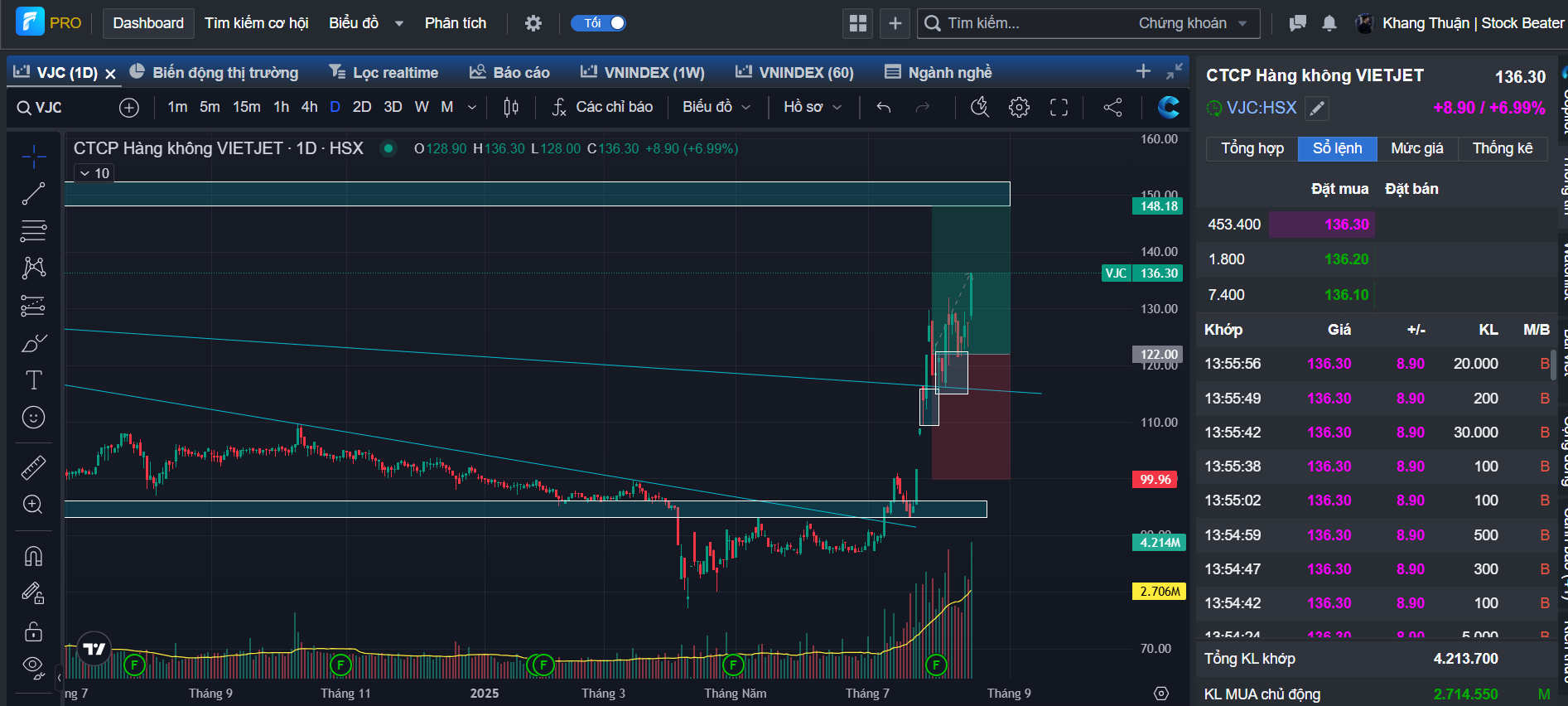 Quan sát khung tuần của VJC có thể thấy cổ phiếu đã bứt phá khỏi cản chéo lớn và đã có nhịp test lại cản → Vượt khỏi kháng cự của xu hướng lớn và đã có nhịp test cản, kỳ vọng tiếp tục mở sóng cho xu hướng tăng mới