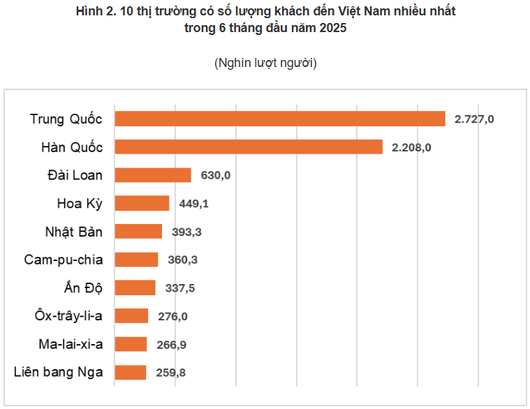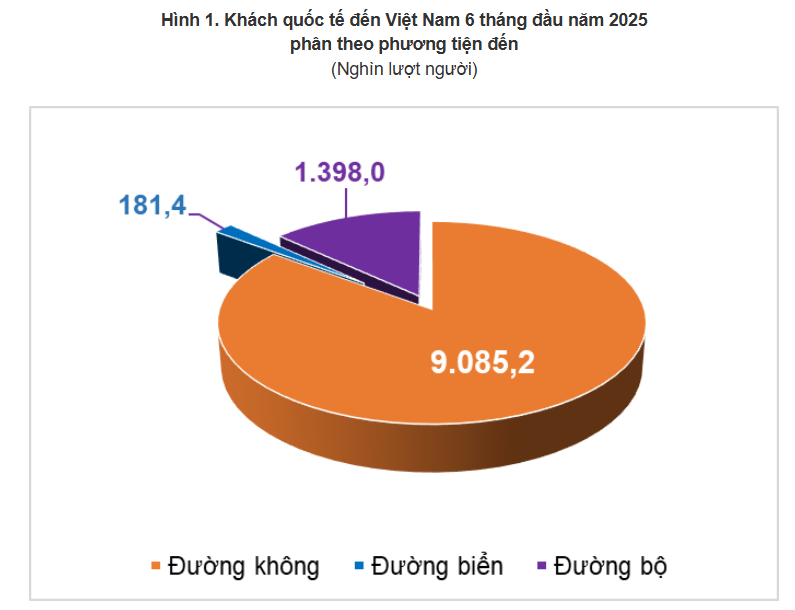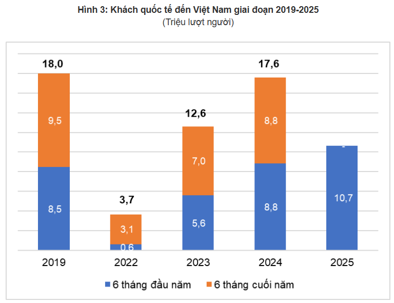 Theo Cục Thống kê (Bộ Tài chính), trong 6 tháng đầu năm 2025, khách quốc tế đến Việt Nam đạt gần 10,7 triệu lượt người, tăng 20,7% so với cùng kỳ năm trước và là số lượng khách đến nước ta đạt mức cao nhất của sáu tháng đầu năm trong nhiều năm qua.