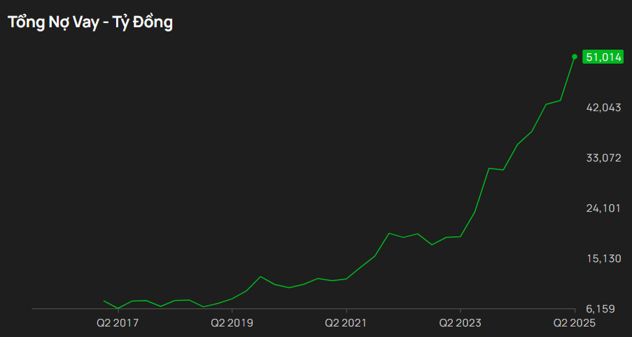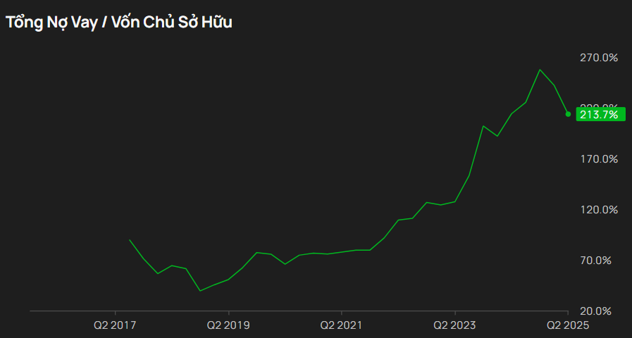 Đòn bẫy tài chính cao: Nợ vay của VJC liên tục tăng cao do cần nguồn vốn để mua thêm tàu bay. Tính đến Q2/2025, Nợ vay/VCSH của VJC đã đạt 2,14 (mức khá rủi ro).