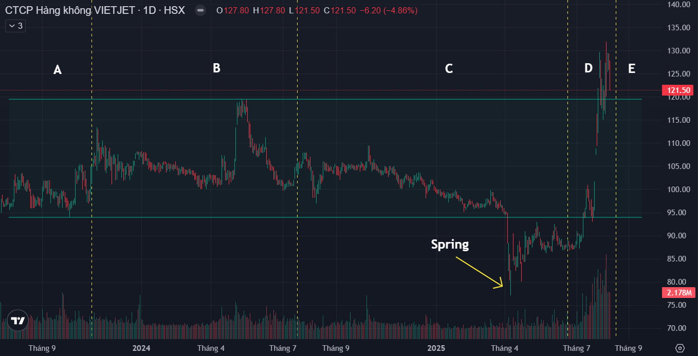 Theo góc nhìn Wyckoff, có thể thấy VJC đã vận động tích lũy khá lâu từ 2023 và hiện tại VJC đang ở cuối phase D của cấu trúc Wyckoff (đã có nhịp SOS) → Kỳ vọng VJC tiếp tục bước vào phase E là pha tăng nước rút của cổ phiếu