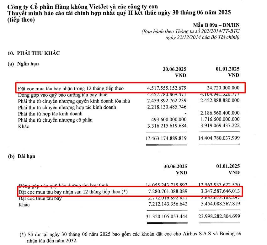 Trong BCTC Q2/2025 của VJC đã ghi nhận gần 12.000 tỷ đồng khoản phải thu từ việc đặt cọc mua tàu bay. Trong đó có hơn 4.500 tỷ đồng ở mục ngắn hạn, tức là sẽ nhận tàu bay trong vòng 1 năm kể từ Q3/2025.