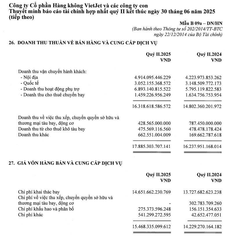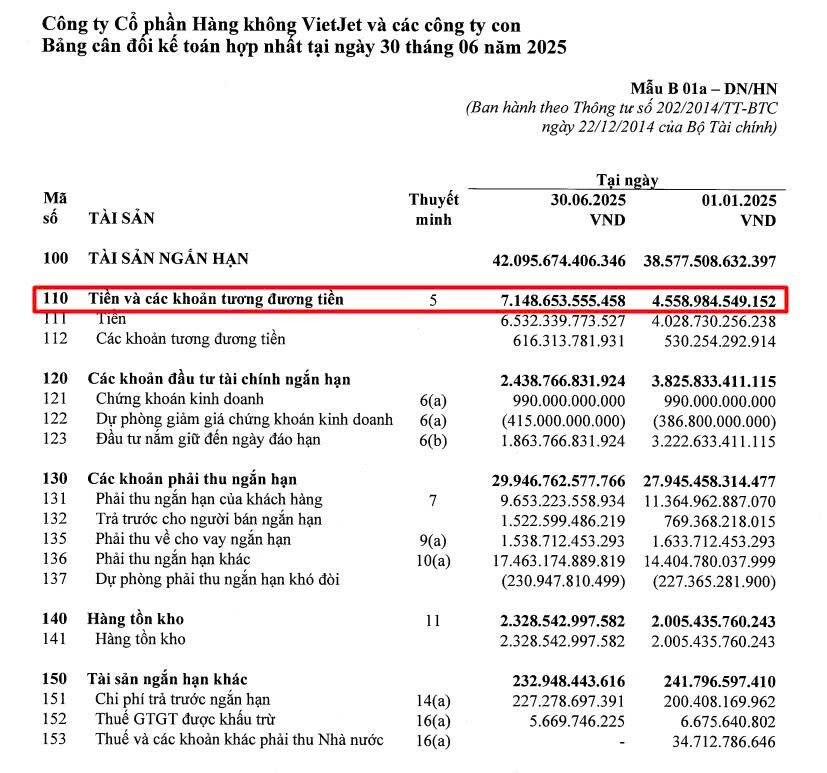 Lượng tiền và tương đương tiền ghi nhận gần 7.150 tỷ đồng, đạt mức cao kỷ lục do trong quý 2/2025 VJC vừa thu 5.000 tỷ đồng từ việc chào bán 50 triệu cổ phiếu phát hành.