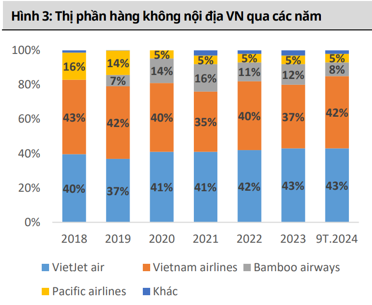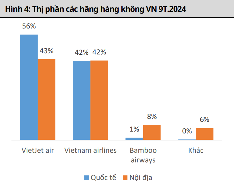 Thị phần quốc tế của Vietjet 9T/2024 chiếm 53%, cao hơn hẳn so với đối thủ cạnh tranh trực tiếp là Vietnam Airlines với 42% thị phần. Nhìn lại số liệu thống kê ở phần trên có thể thấy lượng khách du lịch quốc tế đang có mức tăng trưởng rất tốt, do đó việc Vietjet chiếm thị phần khách quốc tế cao sẽ là một lợi thế rất lớn đối với doanh nghiệp.