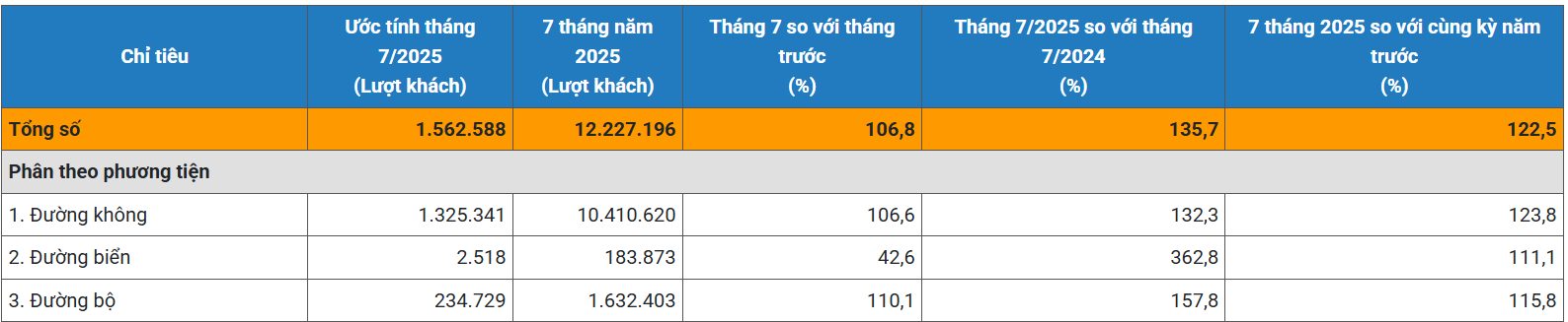 Lượng khách quốc tế đến Việt Nam trong tháng 7/2025 ước đạt 1.562.588 lượt, tăng 6,8% so với 6/2025 và tăng 35,7% so với cùng kỳ năm 2024. Tính chung 7 tháng năm 2025 ước đạt 12.227.196 lượt khách, tăng 22,5% so với cùng kỳ năm 2024 (Nguồn: Cục Du lịch Quốc gia Việt Nam).