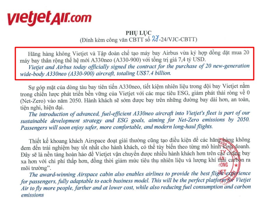 Ngày 22/7/2024, tại Triển lãm Hàng không Quốc tế Farnborough Airshow 2024, Vietjet và Tập đoàn chế tạo máy bay Airbus vừa ký hợp đồng đặt mua 20 máy bay thân rộng thế hệ mới A330neo (A330-900) với tổng trị giá 7,4 tỉ USD. Trong năm nay, công ty cũng đã hoàn tất đơn đặt hàng thêm 20 tàu bay thân rộng A330neo, nâng tổng số đơn đặt hàng tàu bay thân rộng lên 40 chiếc.