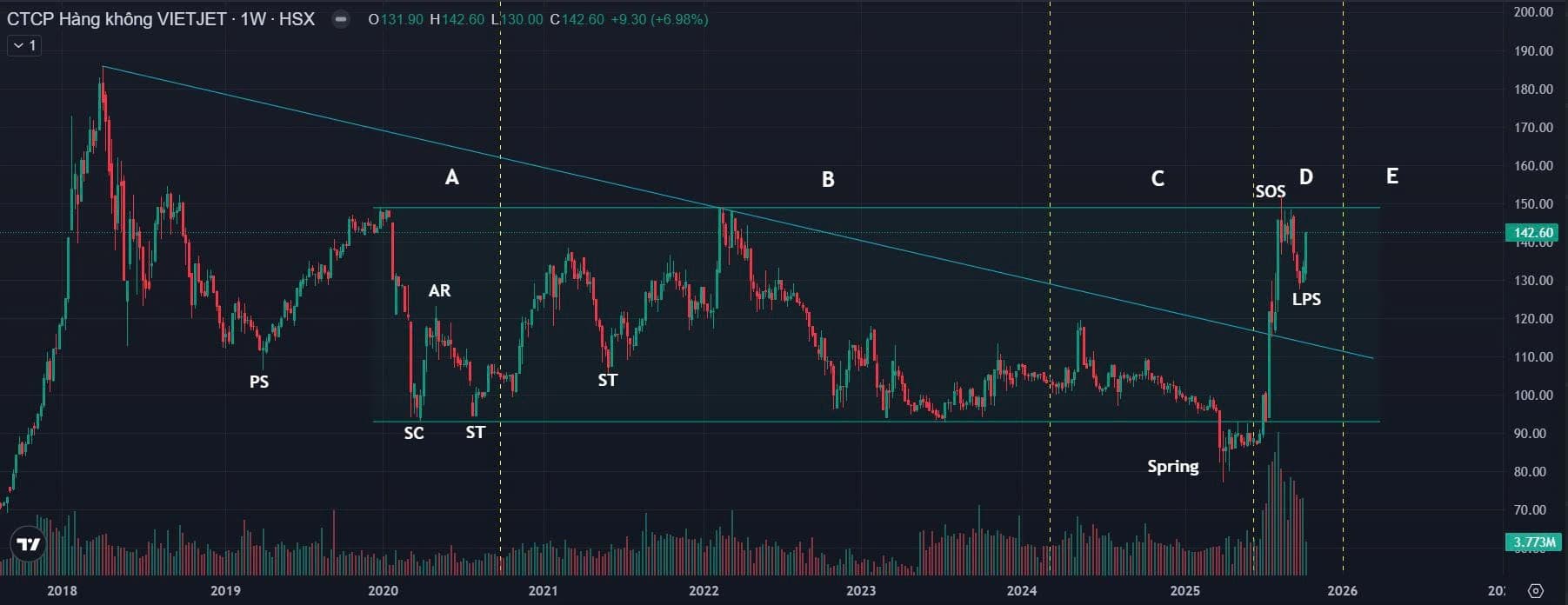 VJC theo góc nhìn Wyckoff, có thể thấy cổ phiếu vận động rất giống với cấu trúc tích lũy trong hơn 5 năm nay kể từ đầu năm 2020 lúc mà ngành hàng không bị ảnh hưởng nặng nề bởi dịch COVID.