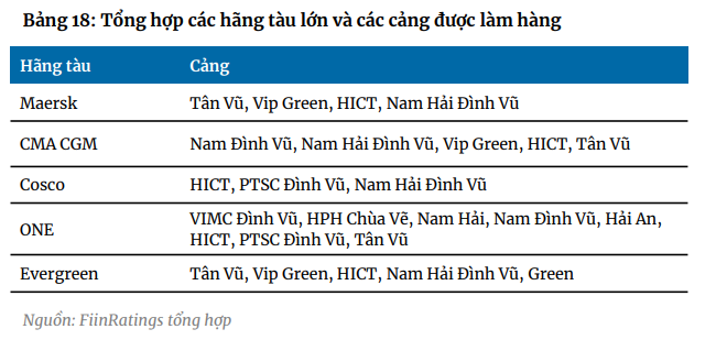 - Cũng theo dự báo của FiinRatings, với những thay đổi lớn đổi cấu trúc các liên minh có thể ảnh hưởng lớn tới sản lượng xếp dỡ và hiệu suất cảng. Với vị trí thuận lợi nằm trên tuyến đường huyết mạch giao thương hàng hải quốc tế, ngành cảng biển Việt Nam đang đứng trước cơ hội lớn để vươn mình thành trung tâm cảng nước sâu quốc tế khi các cảng của chúng ta sẽ tham gia vào chuỗi cung ứng toàn cầu.