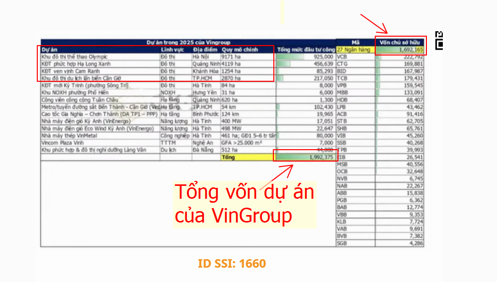 Nhìn vào các bảng thống kê trên có thấy VinGroup đang trong giai đoạn mở rộng hoạt động kinh doanh rất mạnh từ quý 2/2024, khi gia tăng quy mô tài sản bao gồm nợ lên rất nhanh. Các dự án của VinGroup đang triển khai và sắp triển khai trong thời gian tới lên đến con số hơn 1,9tr tỷ đồng, lớn hơn toàn bộ vốn chủ của 27 ngân hàng trong nước cộng lại.