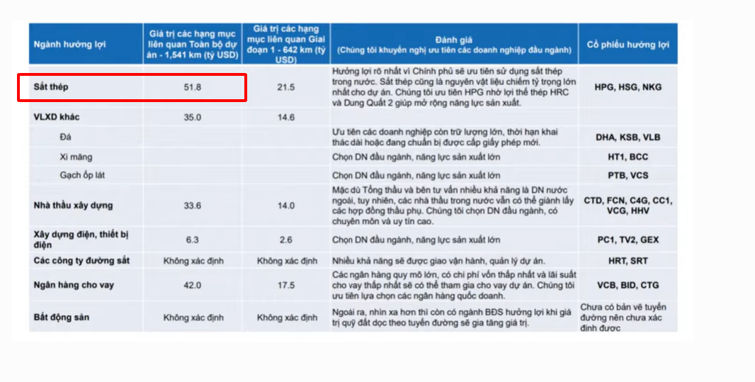 Trong con số 67 tỷ đô đầu tư vào dự án, thì chúng ta nhìn thấy một cái chi phí lớn nhất là hơn 50 tỷ đô. Có nghĩa là 60-70% chi phí để làm đường sắt cao tốc Bắc Nam là chi phí cho các loại sắt thép. Sắt thép ở đây gồm sắt thép cho đường ray, sắt thép để xây dựng nhà ga, rồi là hệ thống điều hướng của tàu,…