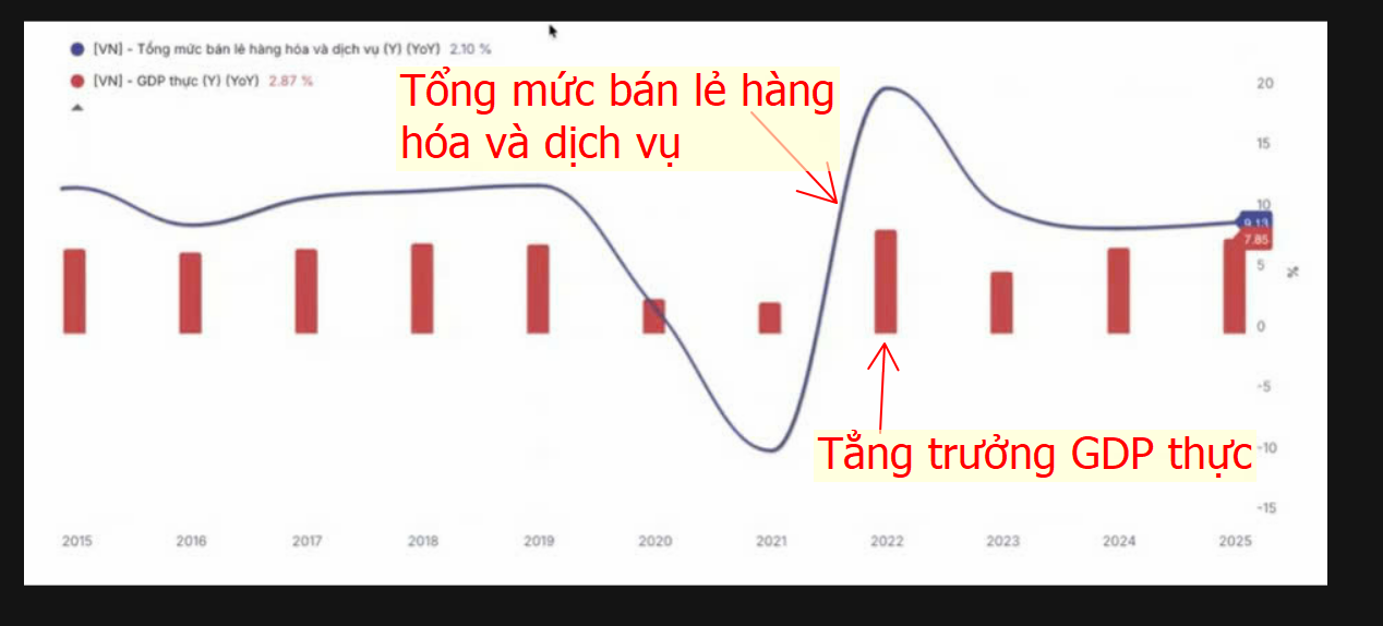 Hình ảnh phía dưới. Ở đây mình lấy cái đường màu xanh là tổng mức bán lẻ hàng hóa và dịch vụ. Có nghĩa là gì? Có nghĩa là bán lẻ hàng hóa nó phản ánh mức chi tiêu, tiêu dùng của người dân Việt Nam trong 1 năm. Và cột màu đỏ tăng trưởng GDP thực. Theo một nguyên lý thông thường, tổng mức bán lẻ hàng hóa tăng cao, GDP sẽ tăng cao.