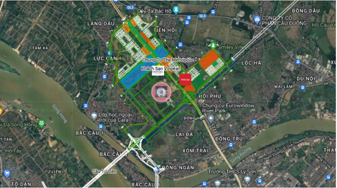 - Vị trí: dự án được xây dựng tại 4 xã thuộc Đông Anh, Hà Nội. Dự án có vị trí đắc địa khi nằm gần kề giữa 2 con sông là sông Hồng và sông Đuống. Sở hữu hệ thống giao thông thuận lợi kết nối tới nội thành và các địa điểm khác như sân bay, QL5,… (Hình 2)