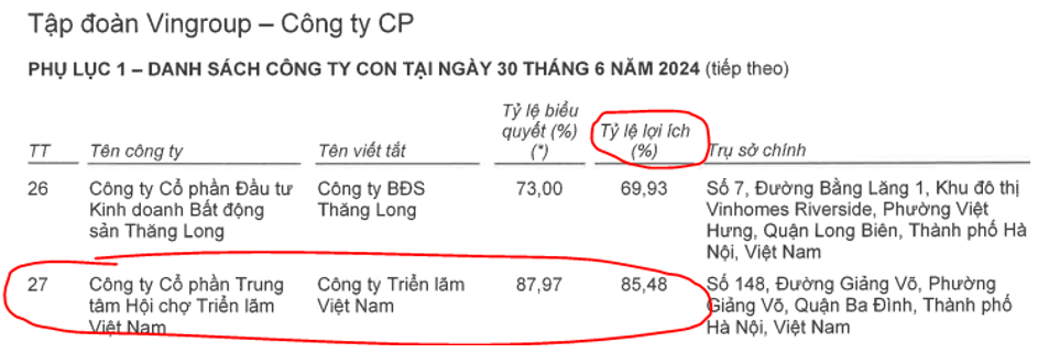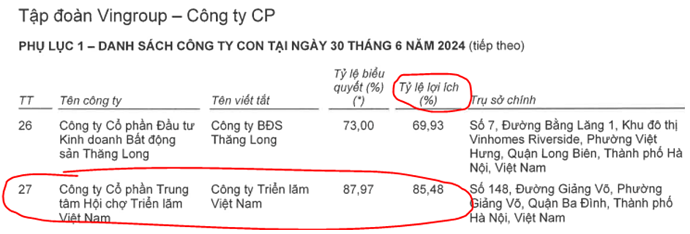 Trước tiên chúng ta sẽ tìm hiểu các thông tin chung về dự án này. Đây là dự án thuộc quyền sở hữu của VEF (Công ty cổ phần trung tâm hội chợ triển lãm Việt Nam), công ty con của tập đoàn Vingroup. Cụ thể Vingroup sở hữu 85.48% tỉ lệ lợi ích tại VEF vì vậy cũng sẽ có 85.48% lợi ích từ dự án này. (Hình 1)