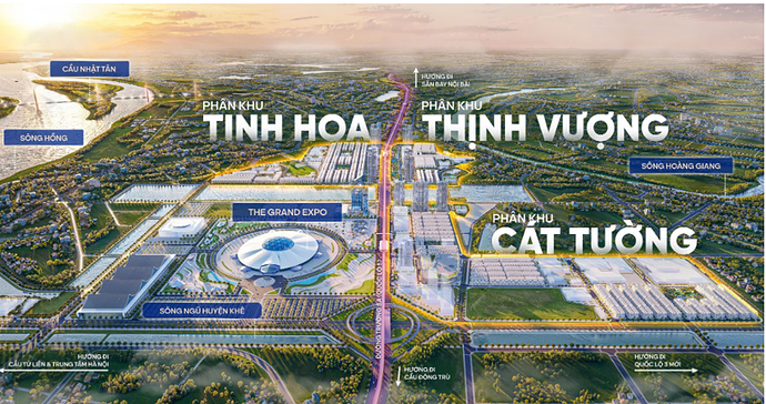 - Dự án chia làm 3 phân khu chính là Tinh Hoa (1,752 sp thấp tầng, 4 tòa chung cư 45 tầng, 1 tòa vp 45 tầng), Thịnh Vượng (847 lô thấp tầng, 4 tòa chung cư 45 tầng) và Cát Tường (1,548 lô thấp tầng, 3 tòa chung cư, 1 tòa vp 45 tầng). (Hình 3)