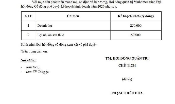 Khủng là từ xứng đáng khi nói về Vinhomes hiện tại , với kế hoạch 2026 dự kiến doanh thu 250k tỷ (+63%) Lãi sau thuế 50k tỷ (+16%)