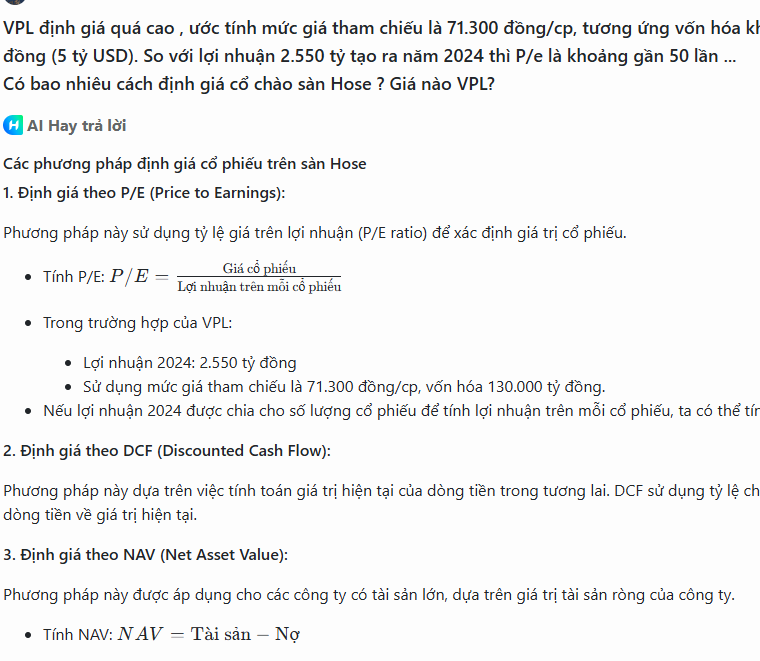 - Tóm lại, có nhiều cách để định giá cổ phiếu chào sàn trên Hose, và mỗi phương pháp có ưu và nhược điểm riêng. Giá cổ phiếu VPL là 71.300 đồng/cp, tương ứng với một mức P/E tốt.