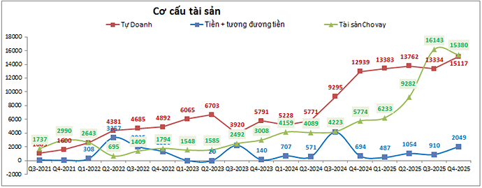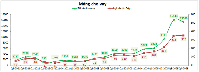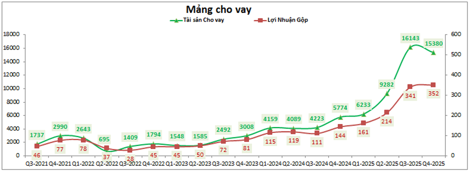 VIX đã tận dụng khá tốt tình hình thị trường để gia tăng tài sản cho vay của mình và tài sản cho vay cũng có phần tăng tốt hơn so với đa phần các công ty khác trong ngành. Tính đến cuối Q4-2025 tổng tài sản cho vay là 15,380 tỷ đồng, tăng mạnh so với đầu năm (5,774 tỷ đồng), tuy nhiên so với Q3 thì tài sản cho vay cũng sụt giảm đôi chút (cuối Q3 là 16,143 tỷ đồng).