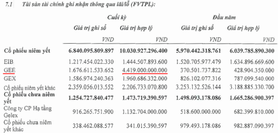 Về chi tiết danh mục cổ phiếu nắm giữ, với tổng tài sản đầu tư vào cổ phiếu lên tới hơn 11,500 tỷ đồng nhưng VIX lại khá tập trung vào các cổ phiếu trong cùng “ hệ sinh thái” với 3 cổ phiếu nắm giữ chính là GEE (chiếm 38.4% tỉ trọng danh mục cổ phiếu), GEX (tỉ trọng 17%), EIB (tỉ trọng 12.6%). Chi tiết danh mục như hình 5 dưới: