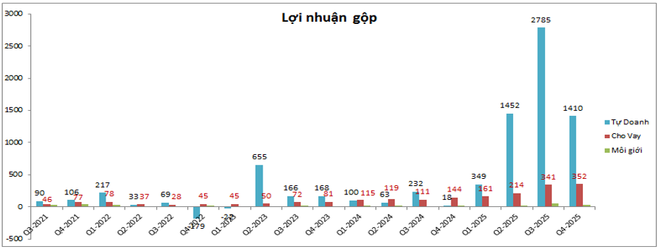 Bóc tách chi tiết lợi nhuận của công ty theo từng mảng kinh doanh chúng ta sẽ nhìn rõ hơn về bức tranh trên. Trong khi mảng cho vay vẫn chậm rãi tiến bước thì tự doanh biến động khá lớn trong năm 2025. (Hình 2)