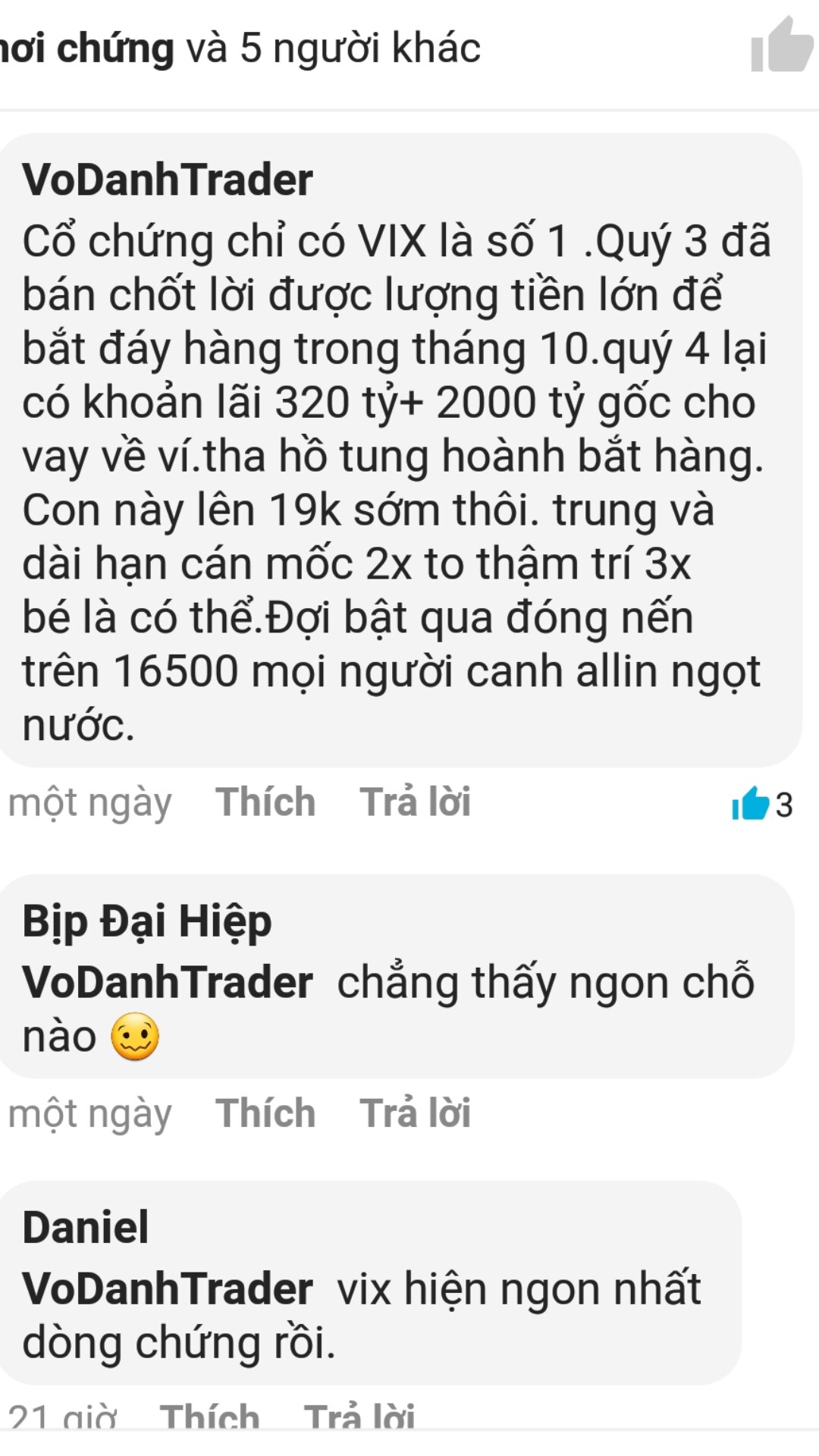 Con Vix này là ổn nhất rồi. Thử xem thằng chứng nào ngon hơn nó. Tiền mặt kinh doanh nhiều, ko phải nghĩ.